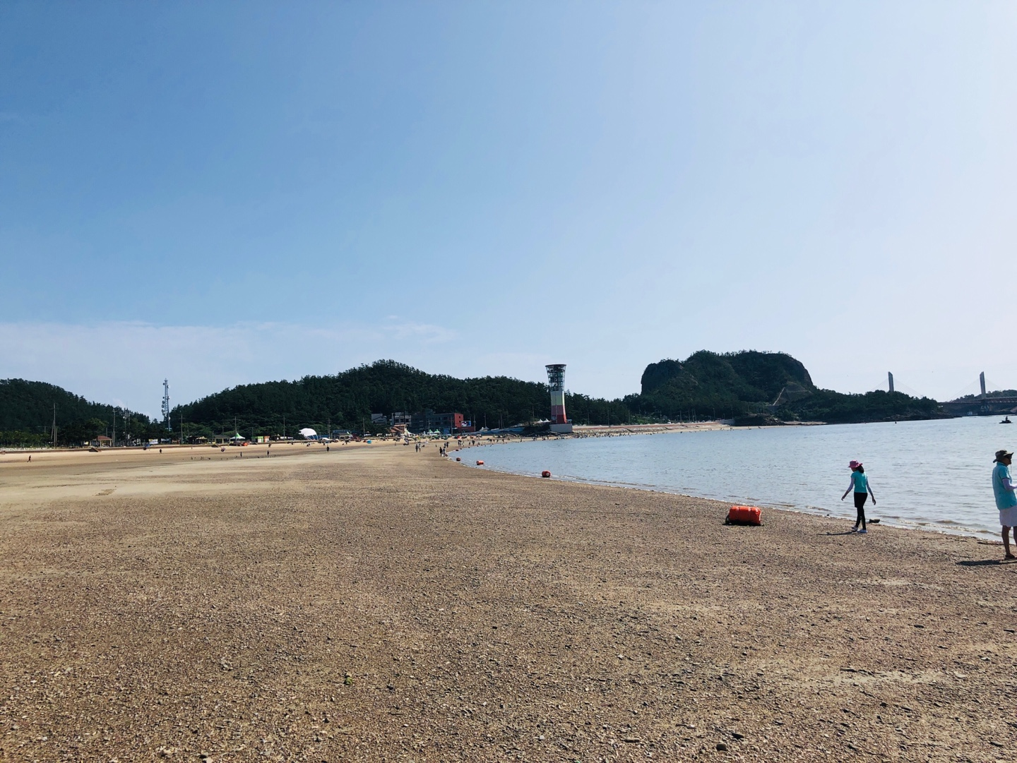주변에 캠핑을 하거나 그늘막을 친 사람들도 볼 수 있는데 코로나라 그런지 의외로 해수욕장에는 사람들이 많지 않다. 그리고 갯벌이 있어서 그런지 물이 더럽다. 여름이라 물이 미지근하다. 그리고 절대 맨발로는 못 들어간다. 날카로운 자갈이 많아서 다친다.