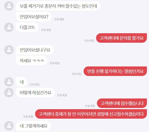 나보고 보풀 제거기로 제거하고 입으라고 한다. 그래서 신고한다고 하니 그렇게 하라고 한다.
