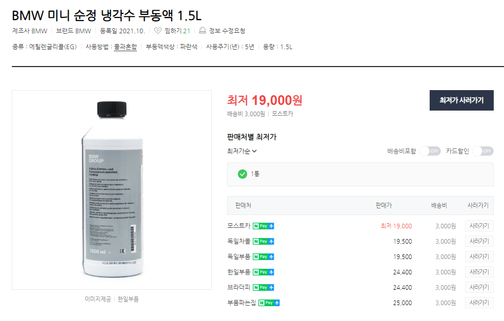 작년에 사둔 부동액이 아직 1/3 정도 남아 있었다. 부동액이 섞이면 안 좋다는 얘기가 있어서 정품을 구매했다. 급하게 부동액이 필요할 때는 수돗물만 넣어서 응급조치를 해도 상관없다. 물론 증류수를 사용해도 좋지만 찾아보니 크게 상관은 없는 것 같다. 다만 주의할 점은 절대 지하수를 사용하면 안 된다. 지하수는 철이 많이 함유되어 엔진 내부에 녹이 발생하기 때문이라고 한다.