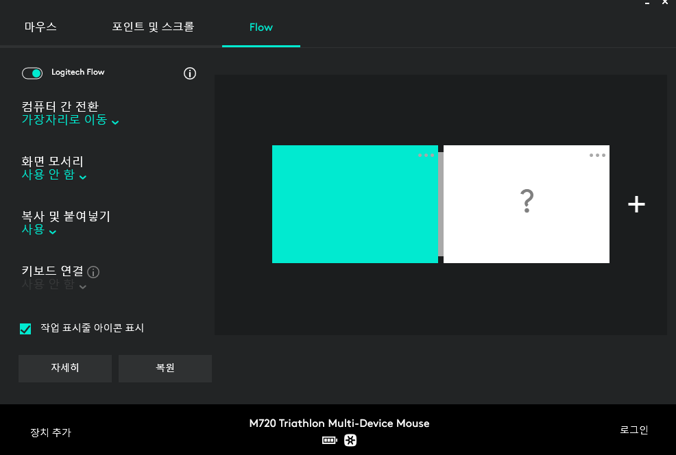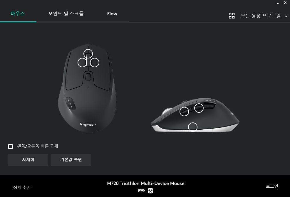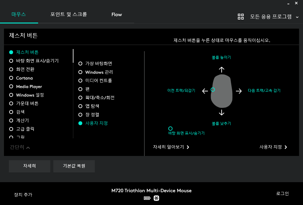 다른 로지텍 마우스들도 그렇겠지만 이 마우스는 프로그램을 설치해서 버튼 설정을 할 수 있다.(왼쪽에 달린 맨 아래 버튼은 구매 후 1주일 후에 있는 줄 알았다...)
