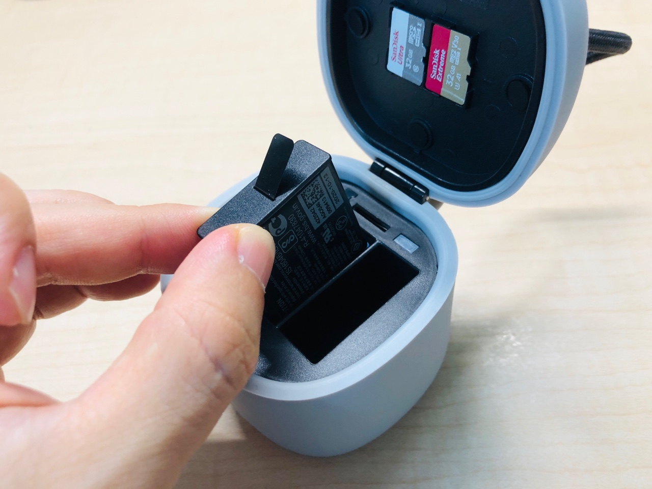 위에는 마이크로 SD카드 두개를 꽂을 수 있고 배터리 위에도 하나더 보관하거나 자료 이동시 꽂을수 있게 되어 있다. 꺼낼때는 누르면 스프링처럼 튀어나오게 되어있다.