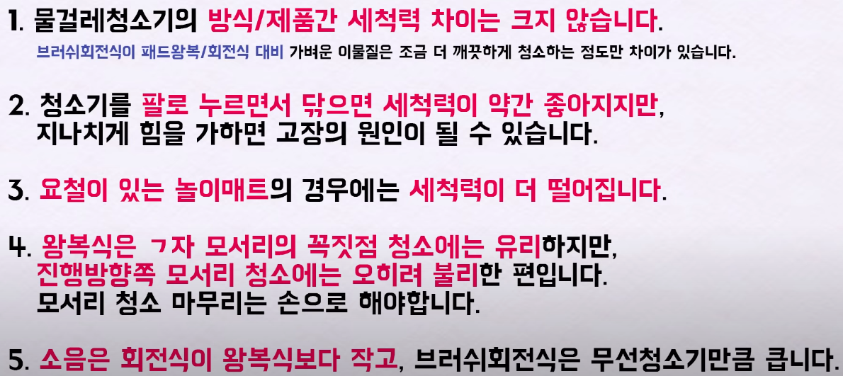 이 영상에서는 물청소기에 따른 차이가 크지 않다는 것을 알 수 있었다.