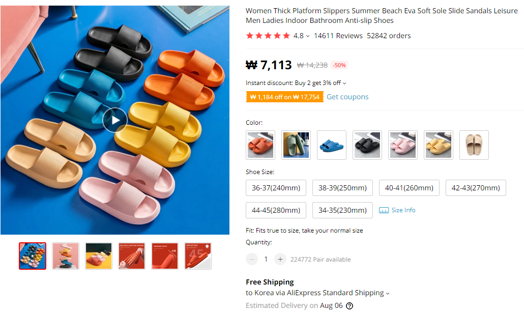 요즈음 구름 슬리퍼가 유행인 듯하다. 사무실에서 많이들 신어서 국내 온라인 쇼핑몰 사이트를 검색해 보았더니 가격이 너무 천차만별인 듯하였다. 혹시 몰라 알리 익스프레스를 검색해 보았다.