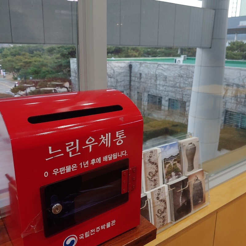 옆에는 이렇게 느린 우체통이 설치되어 있다. 오른쪽에 원하는 엽서를 골라 적어서 넣으면 1년 뒤에 받을 수 있다고 한다. 우표는 모두 무료다. 나도 가족들과 함께 우리 자신에게 하고 싶은 이야기나 그림들을 적어 넣었다.