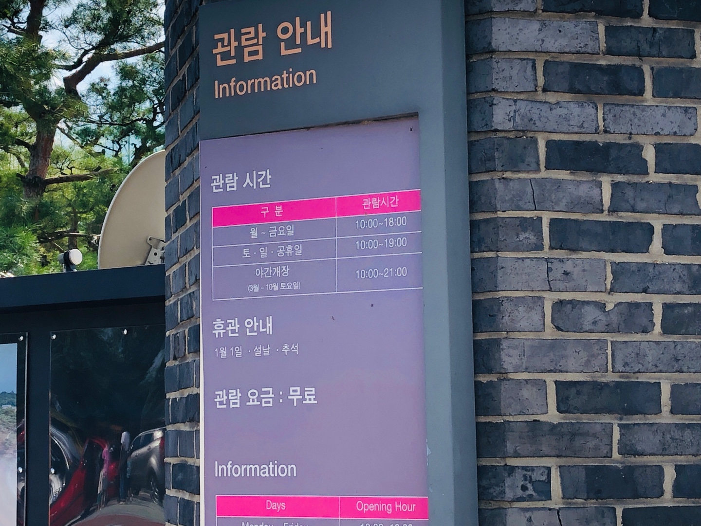 사실 가장 궁금한건 무엇보다도 입장료도 주차비일 텐데 모두 무료다. 위에 사진에 나와 있듯이 관람시간은 오전 10시부터 저녁 6시까지 이고 주말이랑 공휴일은 한 시간 연장된 저녁 7시까지이다. 야간 개장은 저녁 9시까지도 운영을 한다고 하니 홈페이지를 꼭 참고하길 바란다. 휴관은 1월 1일, 설날, 추석이다.